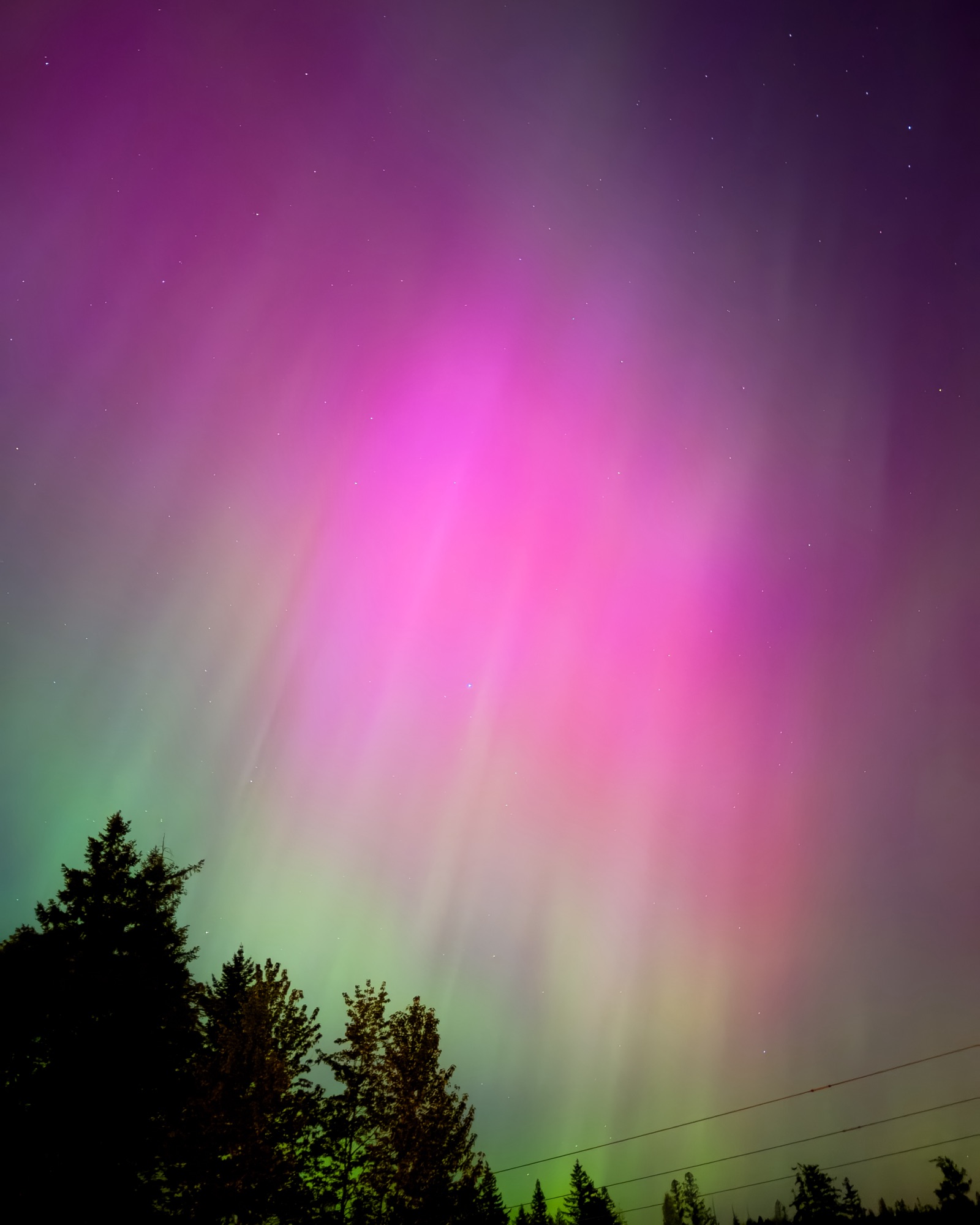 Ariel y mi hijo llegaron de su práctica a casa a eso de las 9:30 de la noche y a las 10:00 pm salimos tras este regalo astronómico, pero sin ninguna expectativa. Nos fuimos camino a Snoqualmie, este lugar queda a algunos 50 minutos desde mi casa, pero en el trayecto comencé a ver actualizaciones en grupos de Facebook sobre personas viendo auroras muy cerca de donde vivo, tomamos la decisión de virar e ir a uno de esos lugares para no tener que guiar tan lejos.